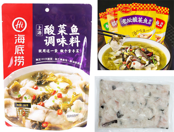挂浆黑鱼片包、老坛酸菜包、酸汤酱包、蒜油包、香料包,酸菜鱼料包里应有尽有。