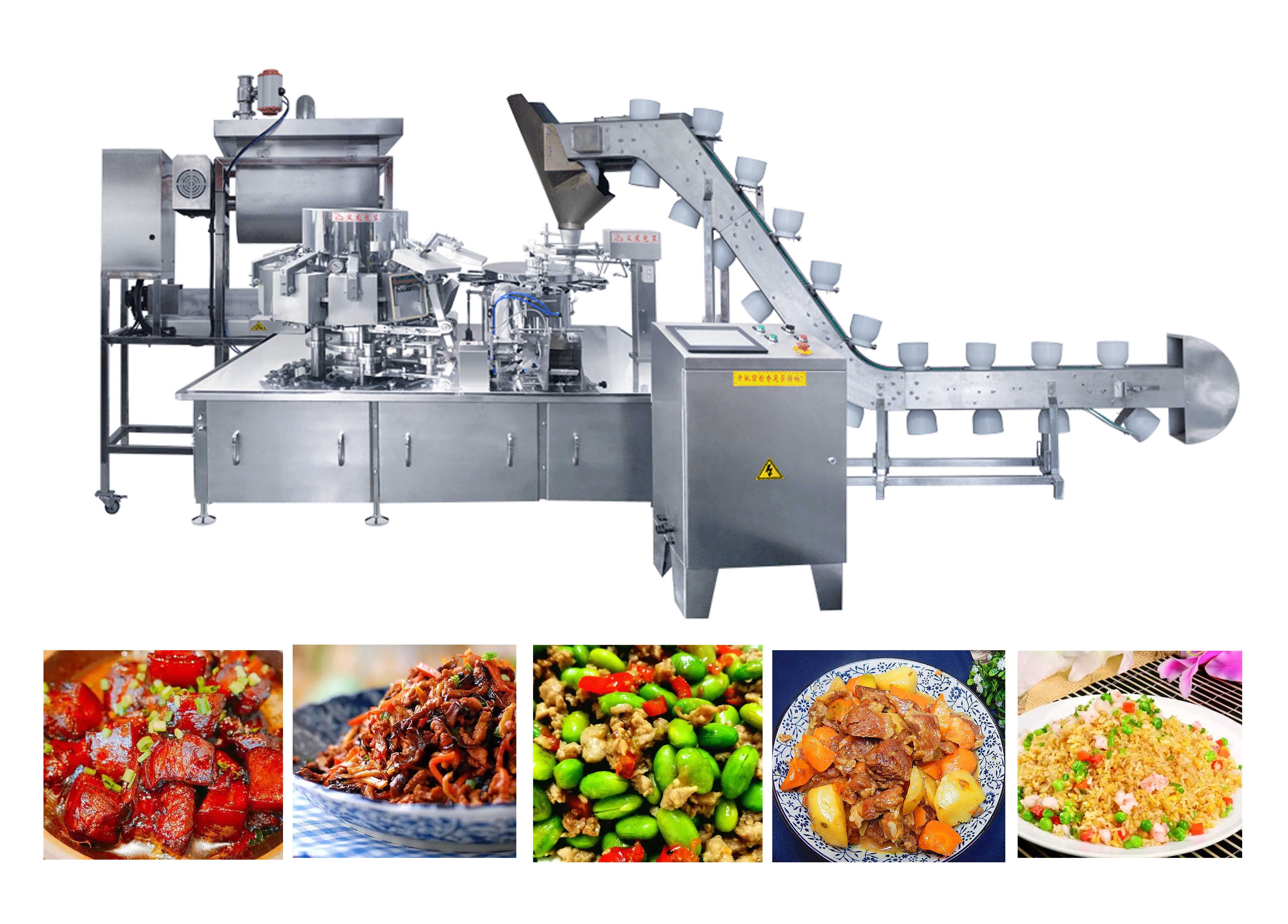碗式提升机将调理好的菜肴充填进包装袋,伺服灌装机进行汤料灌装,最后通过17c吃瓜真空17吃瓜 进行抽真空处理,延长食品存储和保鲜期限。