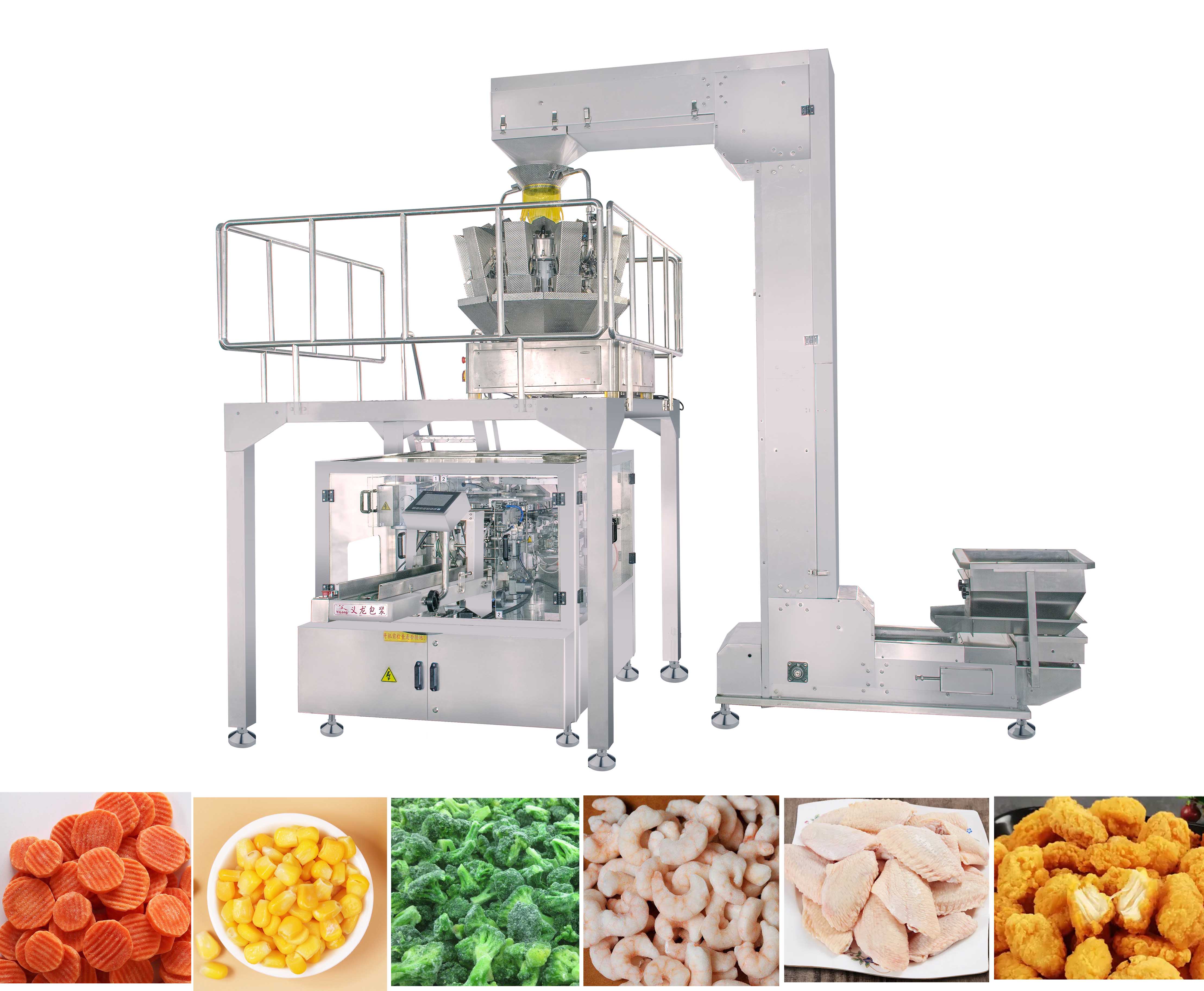 针对冷冻蔬菜、冷冻肉制品、净菜+水等产品进行自动称重包装。