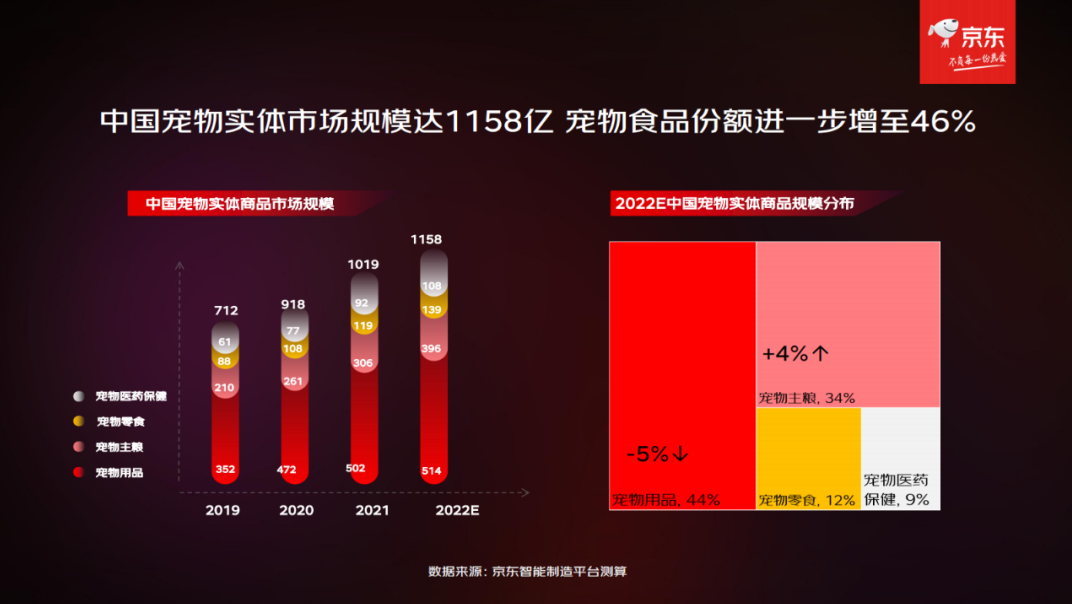 近日,京东宠物正式发布完整版《2022年中国宠物行业趋势洞察白皮书》。总体来看,2022年中国宠物实体市场规模将达1158亿,宠物食品份额增至46%,宠物主粮占比34%,成为最大细分品类。是颇具前景的蓝海市场。