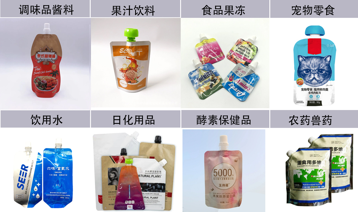 吸嘴袋是指一种底部有水平支撑结构,顶部或侧部带有吸嘴的软包装袋。目前已经作为一种较为新型的包装形式广泛应用于果汁饮料、运动型饮料、可吸果汁果冻、调味品酱料等产品。现在除了食品包装应用外,一些宠物零食、洗涤用品、日用化妆品、保健品、农药兽药等类产品的应用也逐渐增多。